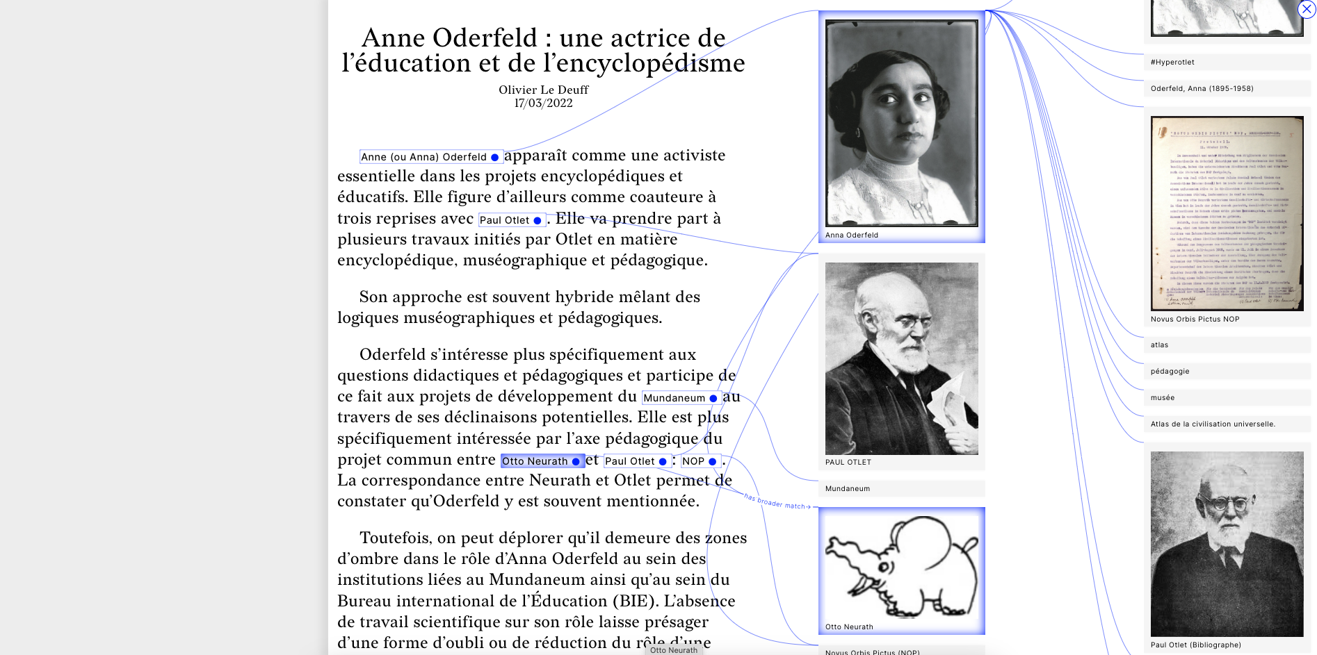 The visualization research centered on the visual juxtaposition and interactive coupling of essays and graph visualizations. The intention was to represent the art historical discourse in close connection with access points into the collection. The concept of the ReFa reader allows for the linear perusal of the essays and the lateral exploration of associated artifacts and entities.