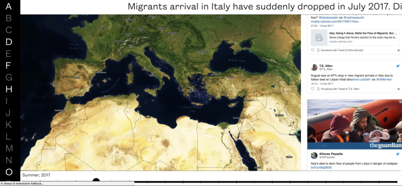 In summer 2017 the flow of migrants to Italy suddenly dropped by 87%, while at the same time different news sources started speaking about a dodgy deal between Italy and a militia situated in Sabratha, North of Libya. Triggered by a Facebook post depicting a militian with Italian supplies, this website reconstructs, through social media feeds, the clashes and conflicts that took place in Sabratha during the end of September. Furthermore, cartography is used to highlight all fightings between multiple parties contesting the ownership of migrants.